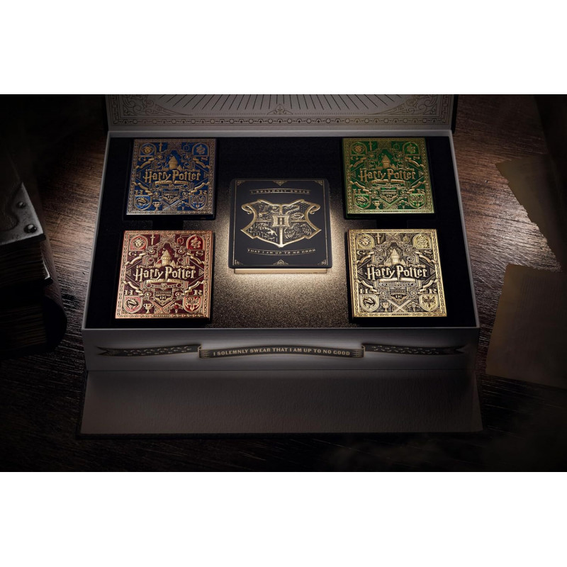 Üretici: theory11 İçerik: 4 adet Harry Potter Hane Destesi (Gryffindor, Slytherin, Ravenclaw, Hufflepuff) Kutu: Masif akçaağaçtan el işçiliğiyle üretilmiş, lazer kazımalı ve antika pirinç donanımlı ahşap koleksiyon kutusu Malzeme (Kartlar): FSC sertifikalı kağıt, Air-Cushion kaplama Basım: The United States Playing Card Company (USPCC) Boyut (yaklaşık mm): 63 x 88 mm (Standart Poker boyutu) Renk: Kırmızı, Yeşil, Mavi, Sarı (Hane Renkleri) Ek Özellikler: Kart kutularında altın ve gümüş folyo ile kabartma detayları, tamamen özel tasarlanmış resimli kartlar
