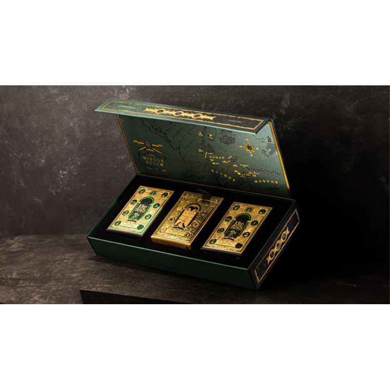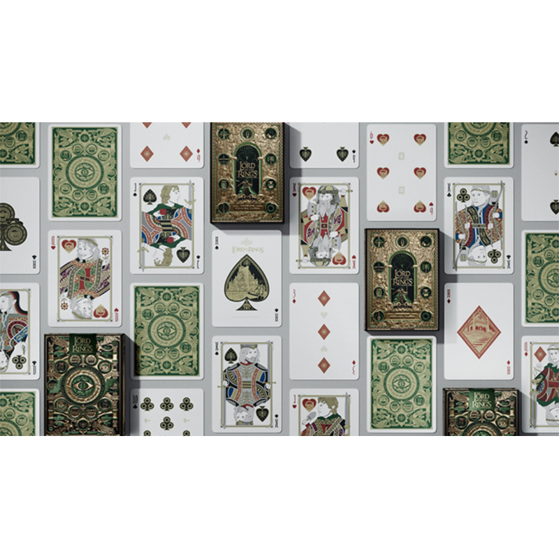 Üretici: theory11 Basım: The United States Playing Card Company (USPCC) İçerik: 2 adet Standart (Yeşil) Lord of the Rings Destesi, 2 adet Özel Altın Folyolu Lord of the Rings Destesi Kutu: Manyetik kilitli, folyo işlemeli koleksiyon kutusu, iç kısımda Orta Dünya haritası Malzeme: FSC sertifikalı kağıt, bitki bazlı mürekkepler, nişasta bazlı laminatlar Boyut (yaklaşık mm): 63 x 88 mm (Standart Poker boyutu) Renk: Yeşil, Altın, Siyah
